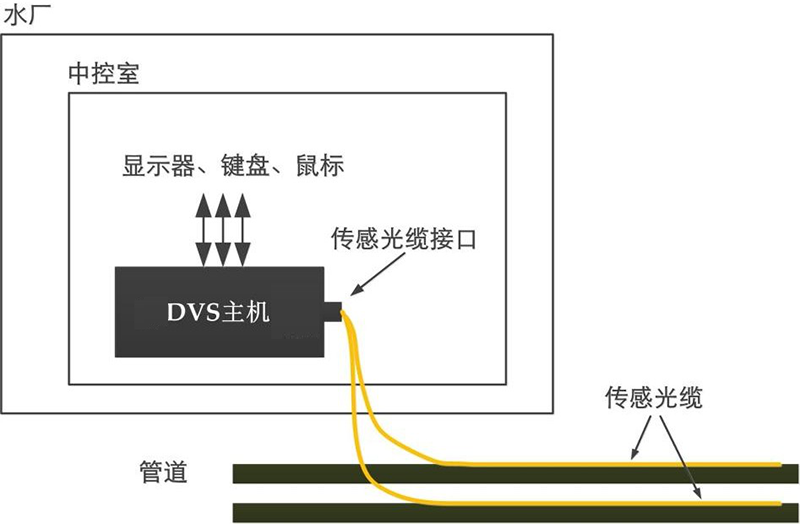 在水廠的中控室(或類似設(shè)備間)內(nèi)放置 DVS 主機(jī),并連接顯示器、鍵盤(pán)、鼠標(biāo), 供給 220V AC 市電,開(kāi)機(jī)使其正常運(yùn)行。將沿管壁貼敷的傳感光纜從地下管道處引入水廠內(nèi)、導(dǎo)入中控室中,選取光纜中的一芯熔接 FC/APC 跳線后,插入 DVS 主機(jī)的傳感光纜接口。運(yùn)行 DVS 泄漏在線監(jiān)測(cè)軟件,系統(tǒng)正常運(yùn)行,可實(shí)時(shí)在線監(jiān)測(cè)管線各處的泄漏情況。