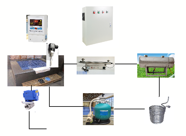 系統(tǒng)由水池、石英砂過濾泵、換熱盤管、管道電熱補償器、紫外殺菌儀、溫度控制儀、成,見下圖: