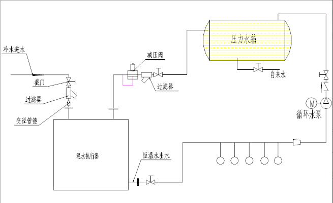 統(tǒng)的浴池熱水系統(tǒng)不論采用何種加熱方式(空氣源熱泵、太陽能、燃氣鍋爐、燃油鍋爐、購買熱水等),為了滿足熱水供應,普遍采用加大儲水箱或提高熱水溫度來解決熱水供應問題,由于浴室熱水用量的不確定性,因而造成了能源的浪費,增大了經(jīng)營者運營成本。本公司提出的恒溫循環(huán)供水方法,為用戶解決了上述問題。系統(tǒng)原理圖如下: